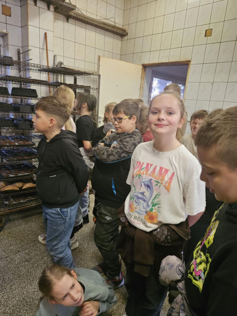 W dniu dzisiejszym uczniowie klasy 4A mieli okazję odwiedzić lokalną piekarnię cukiernię Bebel, aby z bliska przyjrzeć się pracy piekarzy i poznać tajniki wypieku tradycyjnego chleba. Wycieczka okazała się nie tylko ciekawą lekcją zawodu, lecz także inspirującą podróżą do świata zapachów, smaków i codziennego rzemiosła. Już na początku wizyty uczniowie zostali oprowadzeni po piekarni, gdzie mogli zobaczyć profesjonalne urządzenia wykorzystywane w procesie wypieku. Uczniowie dowiedzieli się, jak powstaje chleb i że choć nowoczesne maszyny ułatwiają pracę, to wiele czynności – jak formowanie niektórych bochenków czy dekorowanie pieczywa – nadal wykonuje się ręcznie, aby zachować niepowtarzalny charakter wyrobów. Również