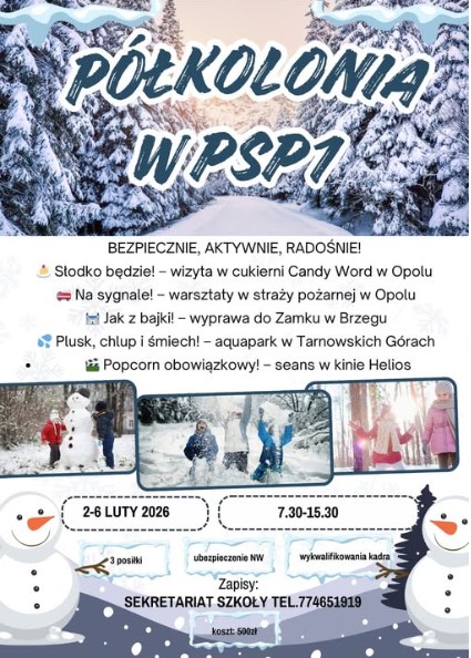Zapraszamy na ZIMOWĄ PÓLKOLONIĘ do JEDYNKI w terminie : 02.02 - 6.02. 2026r.