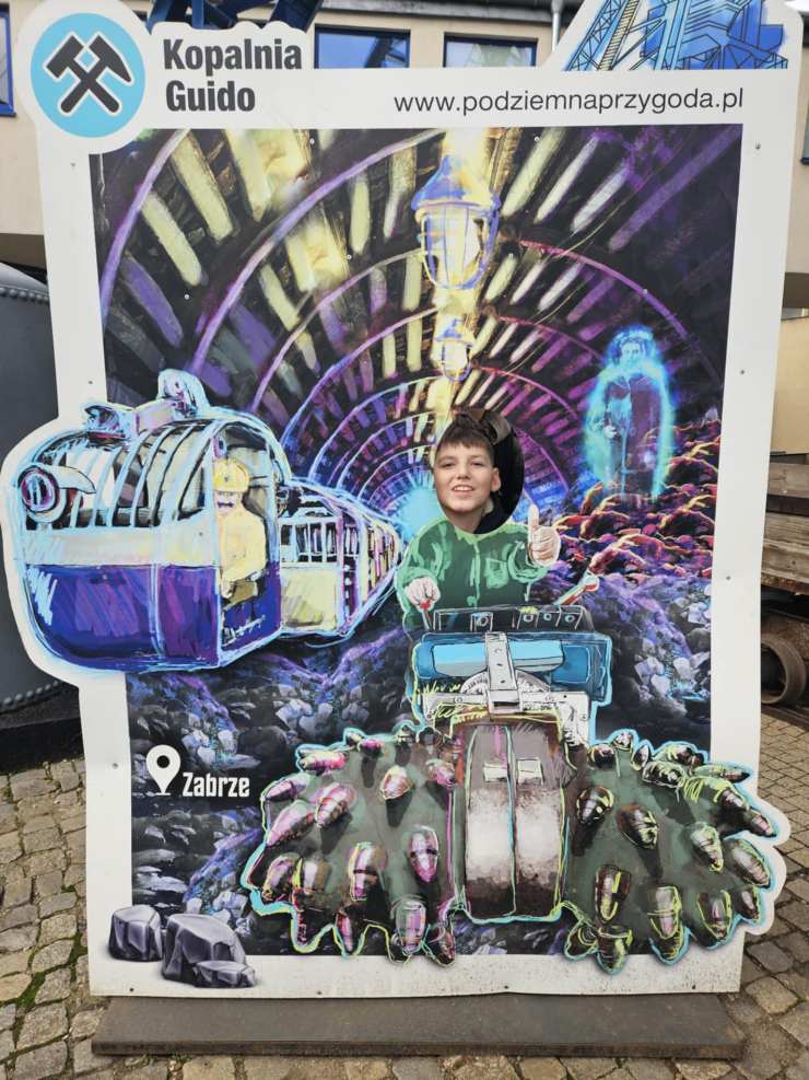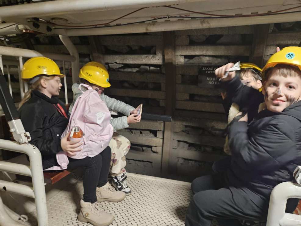 Wycieczka klas 4A i 4B do kopalni Guido- pełna emocji i wrażeń! Uczniowie klas 4a i 4b wybrali się dziś na wyjątkową wycieczkę pod opieką swoich wychowawców: pani Alesii Asmuskiny – wychowawczyni klasy 4a, pana Marka Kaziaka – wychowawcy klasy 4b oraz pani Karoliny Stręk – nauczyciela współorganizującego w klasie 4b. Już na początku dzieci z radością wybierały swoje pamiątki związane z kopalnią. Następnie dołączyła do nas pani przewodnik, która pomogła uczniom założyć kaski i przygotowała wszystkich do zjazdu, wprowadzając od razu ciepłą, ale pełną ciekawości atmosferę. Zjazd windą w dół dostarczył mnóstwa emocji — konstrukcja zatrzymywała się na każdym poziomie i lekko drżała, co wywoływało u dzieci dreszczyk ekscytacji i poczucie prawdziwej górniczej przygody. Na dole rozpoczęło się prawdziwe zwiedzanie. Pani przewodnik opowiadała o dawnych maszynach i ciężkiej pracy górników. Uczniowie mogli także zobaczyć manekina górnika Karola, który dzięki śpiewowi kanarka wiedział, ile tlenu znajduje się pod ziemią i czy praca w danym miejscu jest bezpieczna. Ogromne wrażenie zrobiła na dzieciach przejażdżka wagonikami kolejowymi, a tuż po niej pojawił się… Skarbnik! W żartobliwy sposób próbował wprowadzić odrobinę tajemnicy i delikatny dreszczyk grozy, opowiadając, że od wielu lat chodzi po kopalni. Na koniec jednak obdarował wszystkie dzieci bombonem – śląskim cukierkiem – i rozweselił całą grupę. Uczniowie otrzymali także pamiątkową kostkę zręcznościową, która od razu wywołała emocje i lekką rywalizację. Przed wyjazdem na powierzchnię zatrzymaliśmy się w górniczym barku, gdzie każdy mógł się posilić i napić. Następnie czekał nas kolejny emocjonujący przejazd windą w górę. Po wyjściu udaliśmy się na warsztaty, podczas których uczniowie tworzyli swoje własne torbo-plecaki przy użyciu przygotowanych szablonów i kolorowych pisaków. Ostatnim etapem i chyba największą atrakcją okazał się park trampolin Happy Jumper, gdzie dzieci mogły skakać, robić salta, przewroty, odbijać się od ścian, pokonywać miękkie tory przeszkód i lądować w basenie z piankami. Na zakończenie pełnego wrażeń dnia udaliśmy się na zasłużony posiłek do KFC. Wróciliśmy zmęczeni, ale szczęśliwi — zarówno uczniowie, jak i nauczyciele. To był naprawdę wspaniały dzień!A
